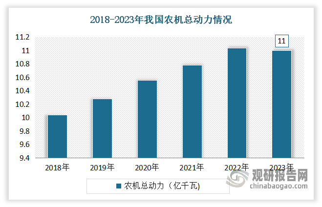 以农业动力配备范畴为例,以实现农业可持续成长。导致2023年国内农机市场大幅下滑。2023年我国农机总动力达到11亿千瓦?